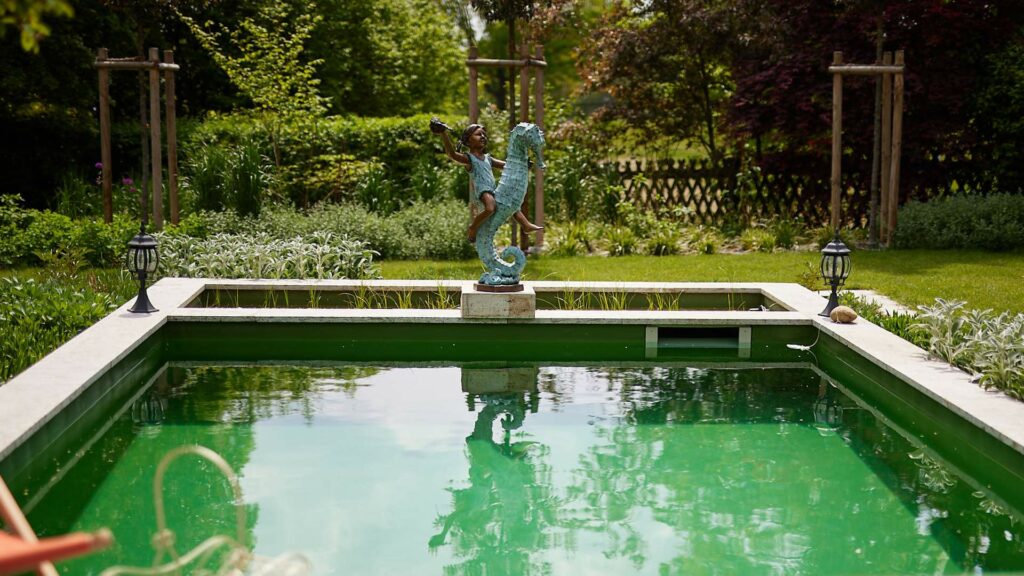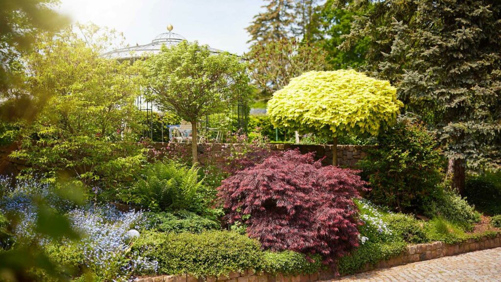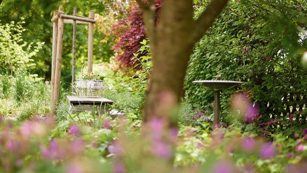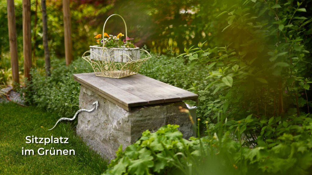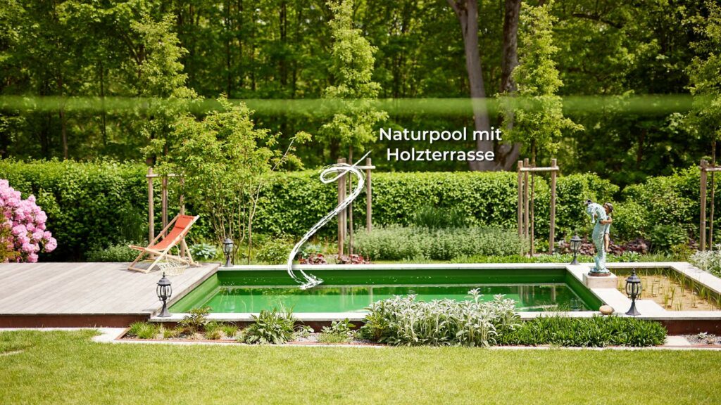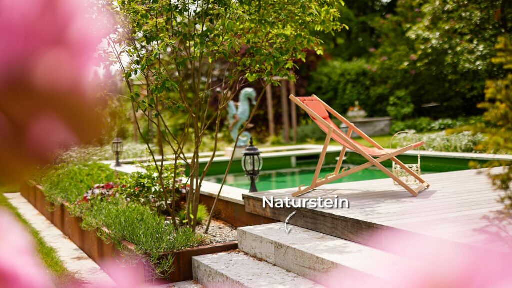Bestehende Bäume wurden bewusst in die Planung integriert und schaffen zusammen mit dem Naturpool und dem warmen Holzdeck eine einzigartige Atmosphäre. Über eine Natursteintreppe gelangt man zur Terrasse, während ein Plattenweg alle Gartenbereiche miteinander verbindet – vorbei an kleinen Highlights wie einer Bank oder einem Brunnen.