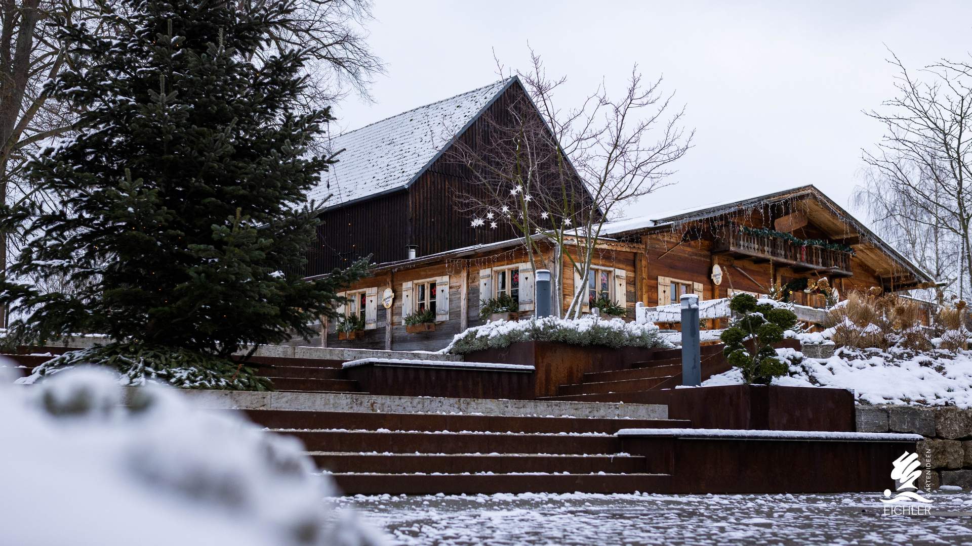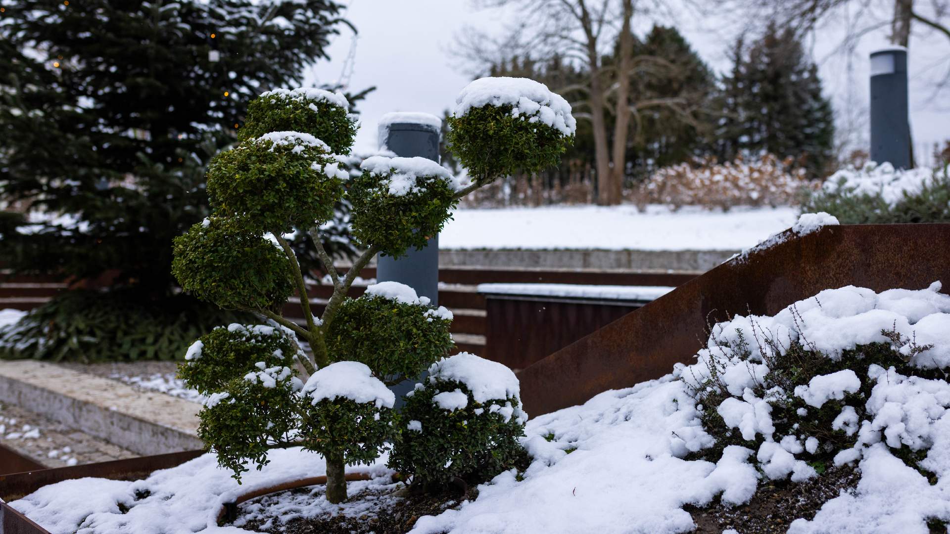 Im Garten des Hotel Beierlein treffen klare Formen auf winterliche Ruhe.