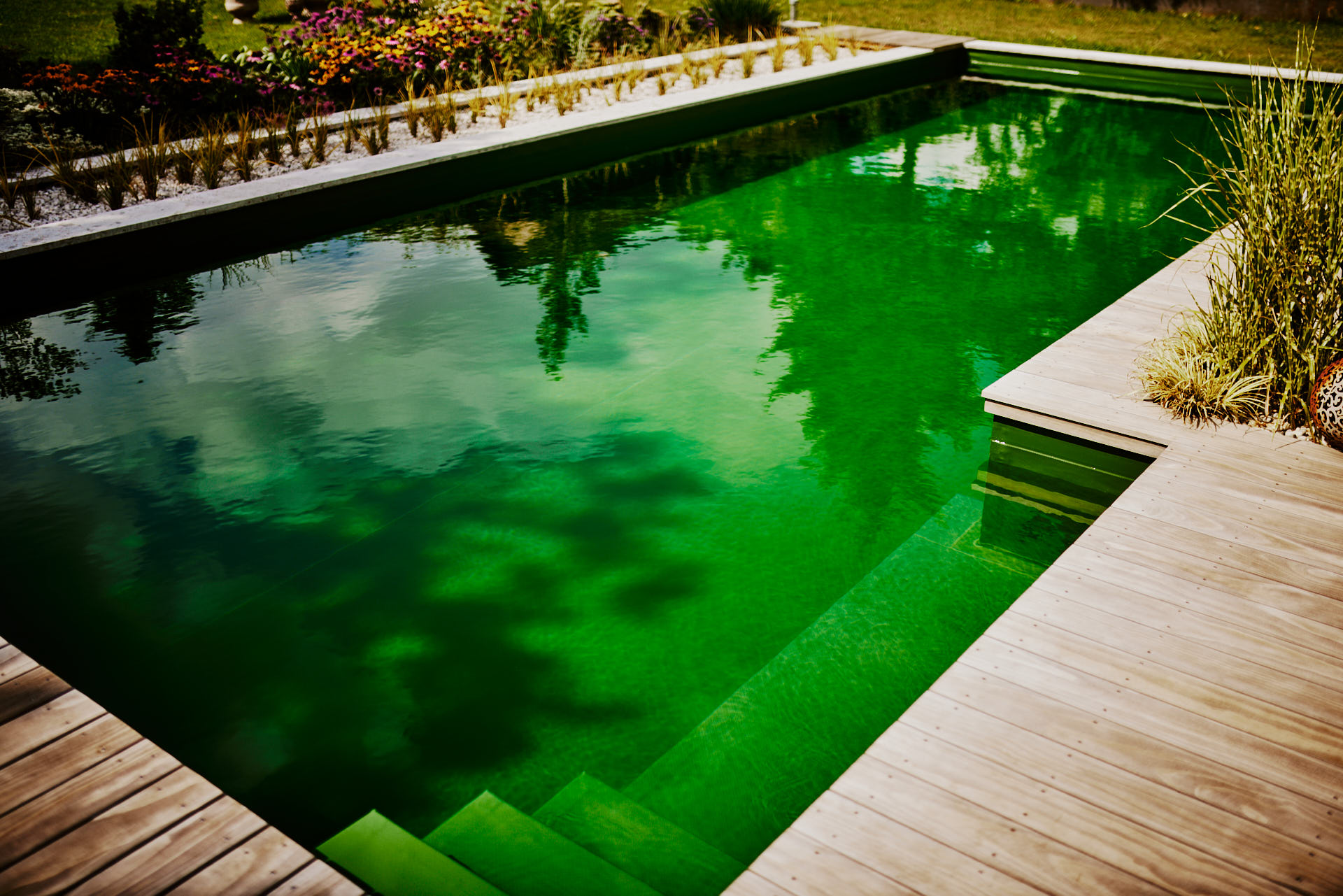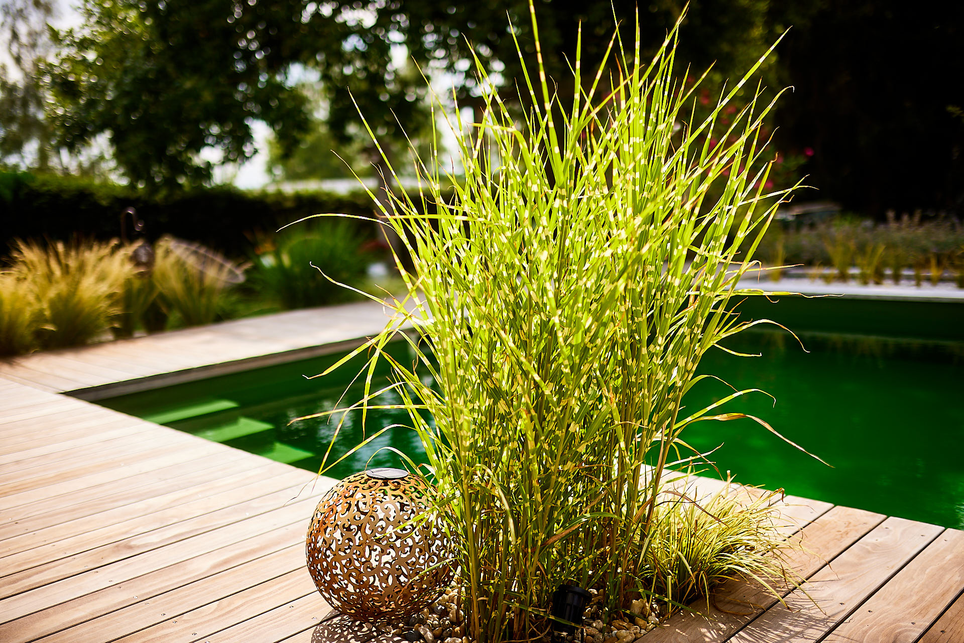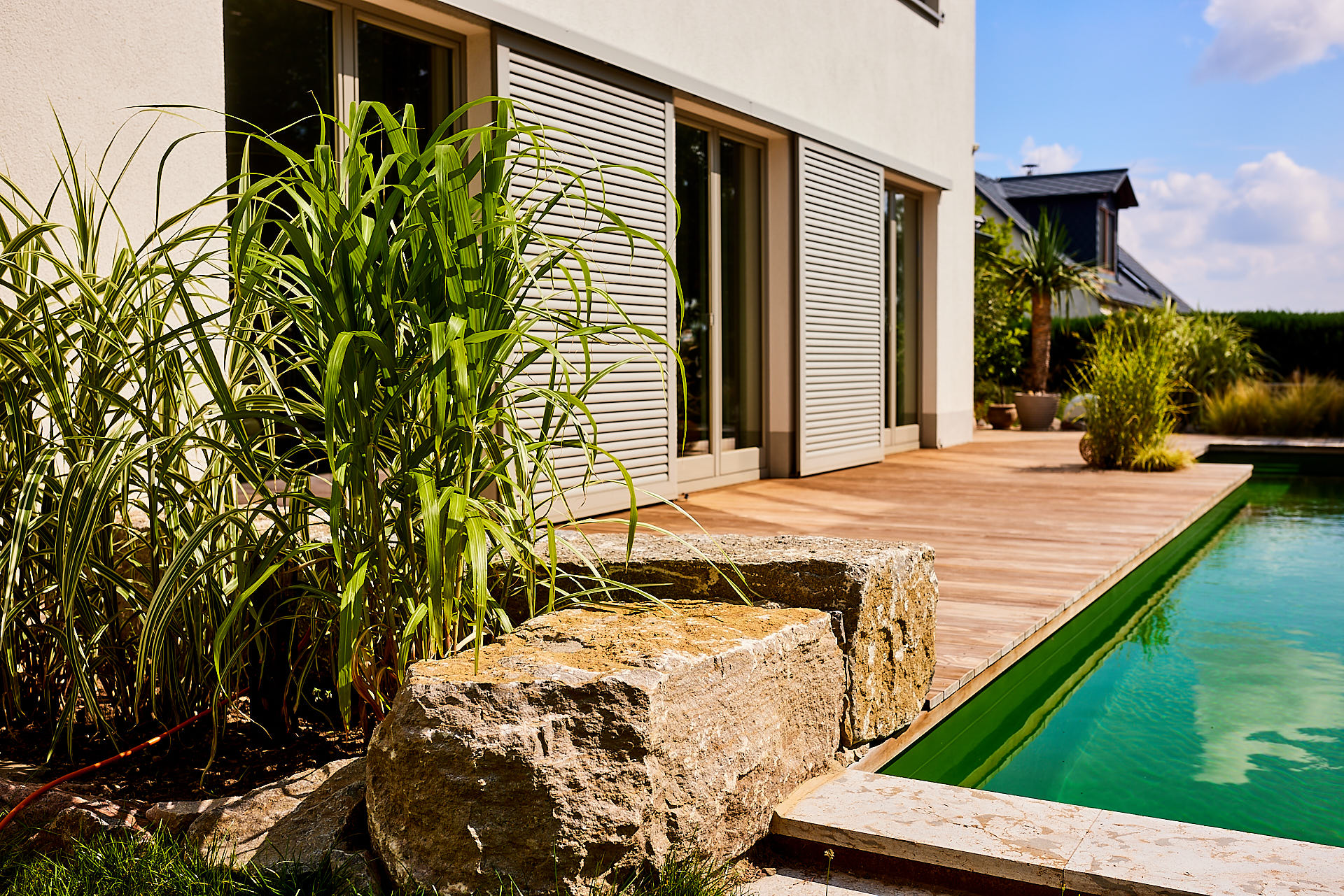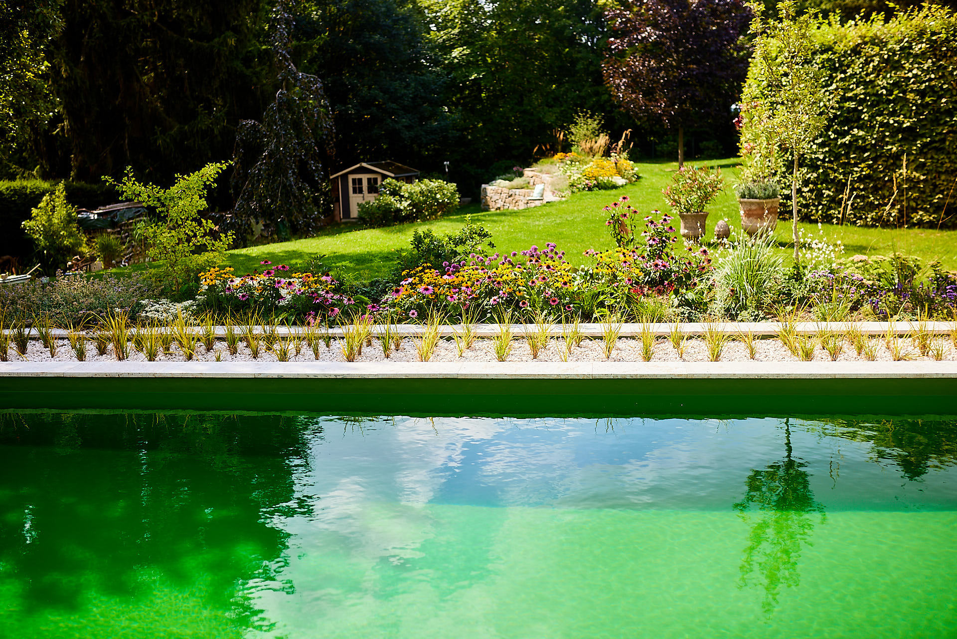 Aus dem Haus kommend, führt der Weg die Besucher über eine moderne Holzterrasse in den Garten. Anliegend an dieser befindet sich mit 11 x 13,5 Metern das Highlight des Gartens, der Naturpool. Klares Wasser lädt hier zum Schwimmen und zum Verweilen an warmen Sommertagen ein.