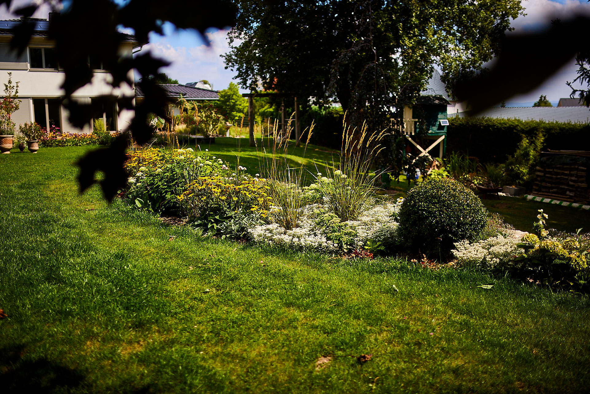 Hochgewachsen und geschwungen stehen die Hecken und Pflanzungen inmitten der grünen Wiese und teilen den Garten in verschiedene Bereiche, die darauf warten, entdeckt zu werden. Zwischen ihnen lässt sich eine Sitzecke finden, welche bewusst als ruhiger Rückzugsort angelegt wurde – ideal für einen Kaffee am Nachmittag oder ein gutes Buch im Abendlicht.