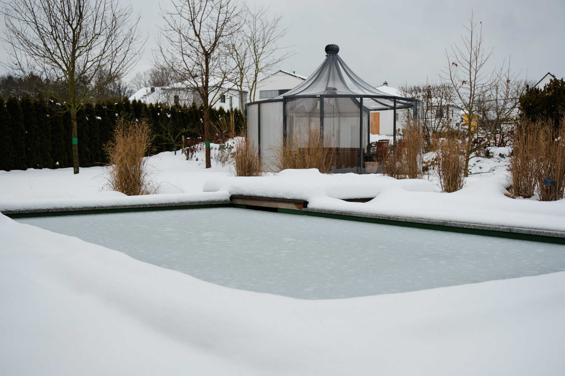 Beim Poolbau wurden Notwendigkeit und Nutzen verbunden. Aufgrund der Grundstückslage in einem eng besiedelten Wohngebiet ist der Wunsch nach Privatsphäre und Sichtschutz im Garten gewachsen. Dafür wurde der beim Aushub entstandene Erdboden genutzt. Statt diesen zu entsorgen, wurde er vor Ort weiterverwendet. Aus dem Material entstand ein kleiner Hügel am Rand des Grundstücks, auf welchem sich nun Stauden und Bäume befinden, welche den Garten vor Blicken abschirmen.