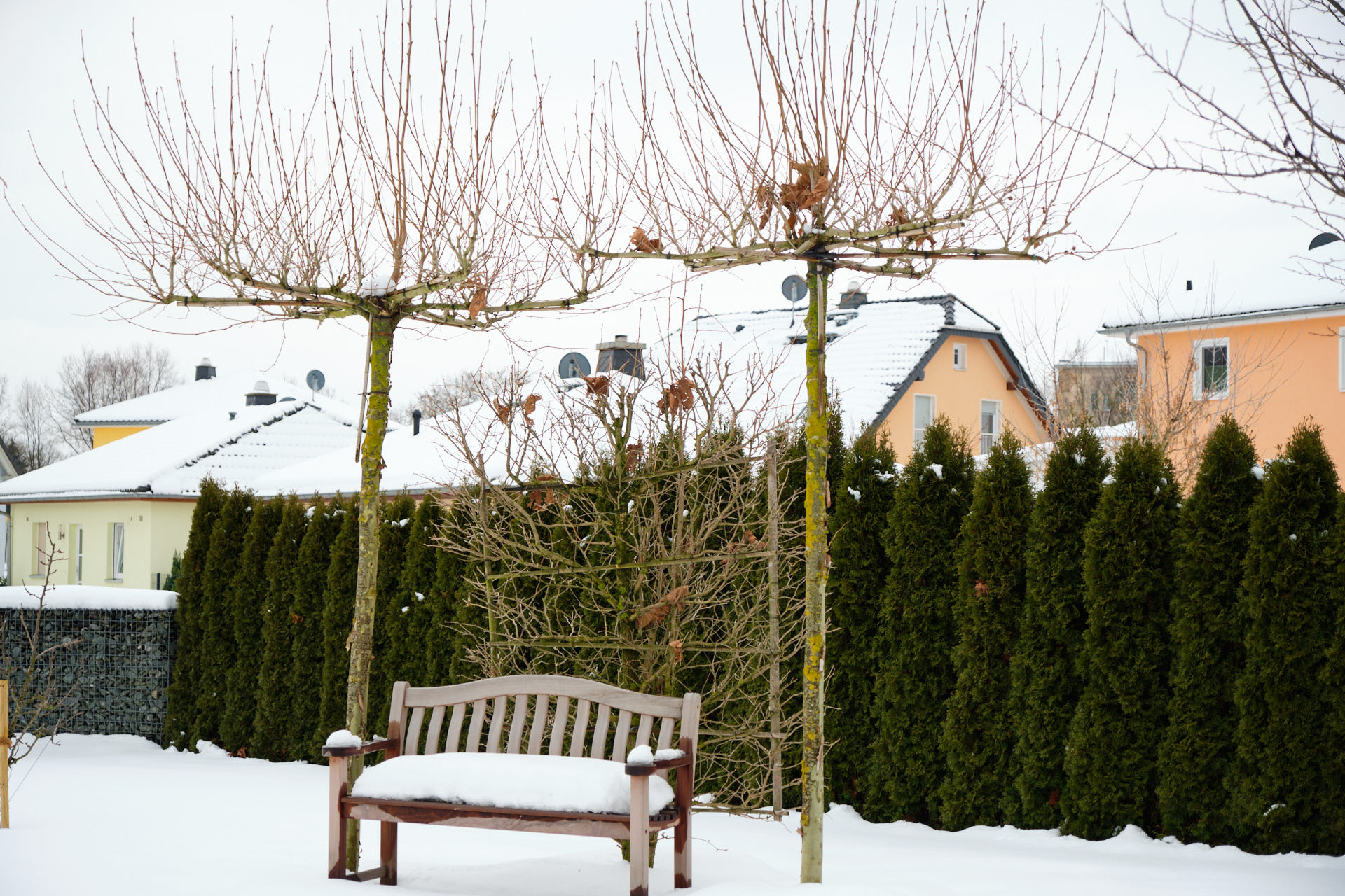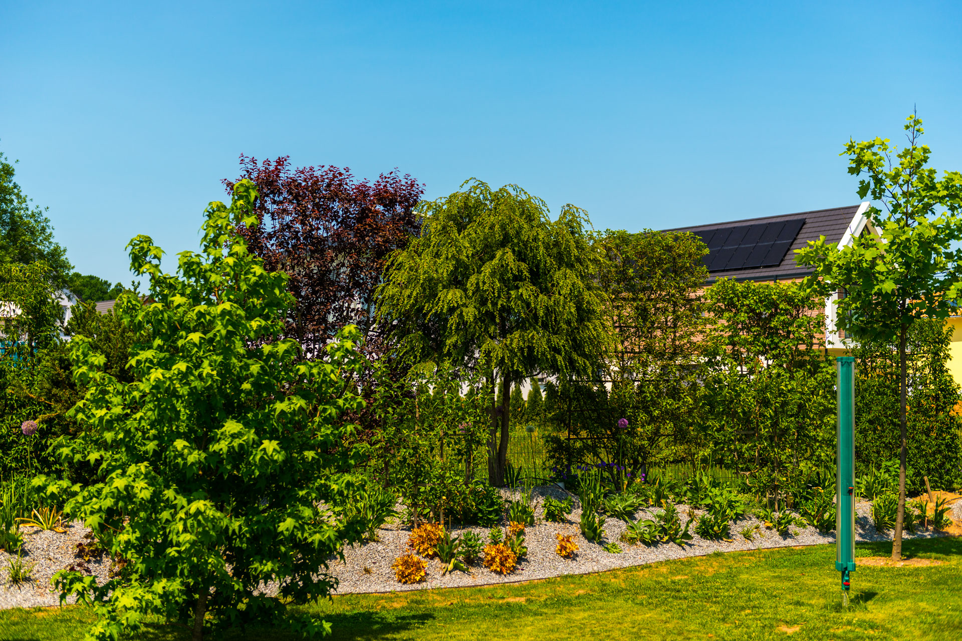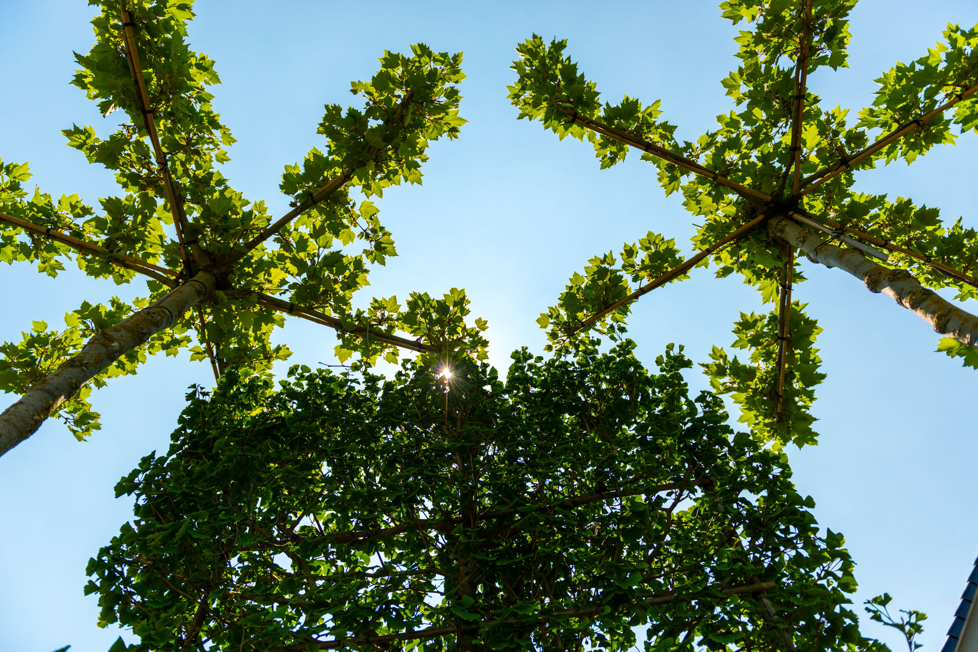 Ein besonderes pflanzliches Highlight: die Dachplatanen. Mit den speziell flach gewachsenen Ästen sind sie ein echter Hingucker und gleichzeitig nützlich. Sie dienen nun als natürliche Schattenspender und verleihen dem Garten eine mediterrane Atmosphäre.