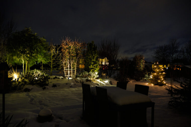 Umgeben ist der Naturpool von Kiesflächen und am Rand befindet sich ein kleines Holzdeck, welches perfekt ist, um nach der Abkühlung kurz in der Sonne zu verweilen. Abends sorgt dann eine gezielte Beleuchtung für stimmungsvolle Lichtakzente und verwandelt den Garten in eine echte Wohlfühloase.