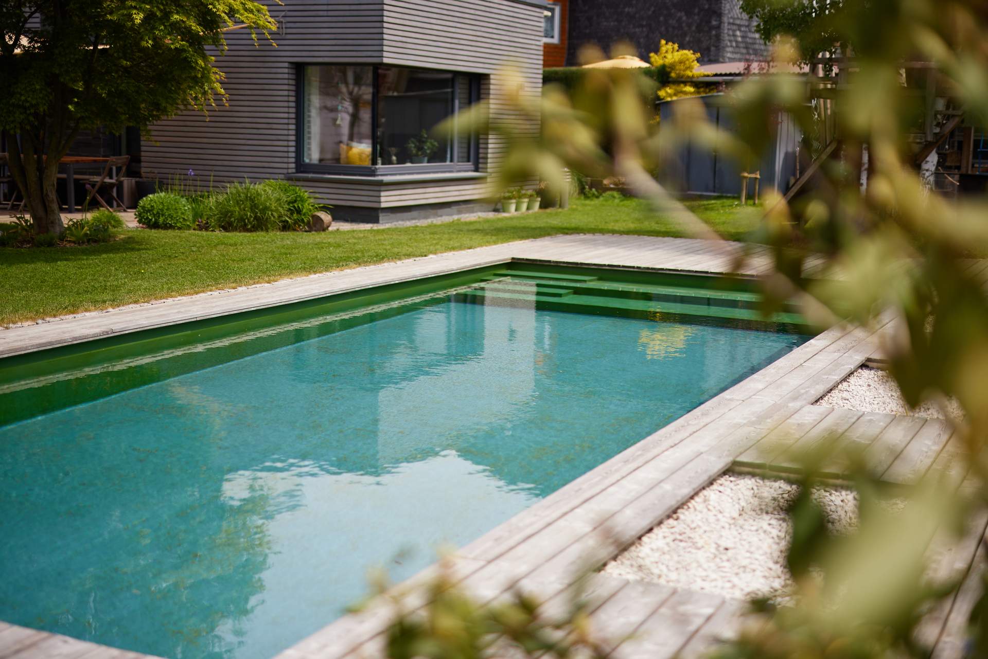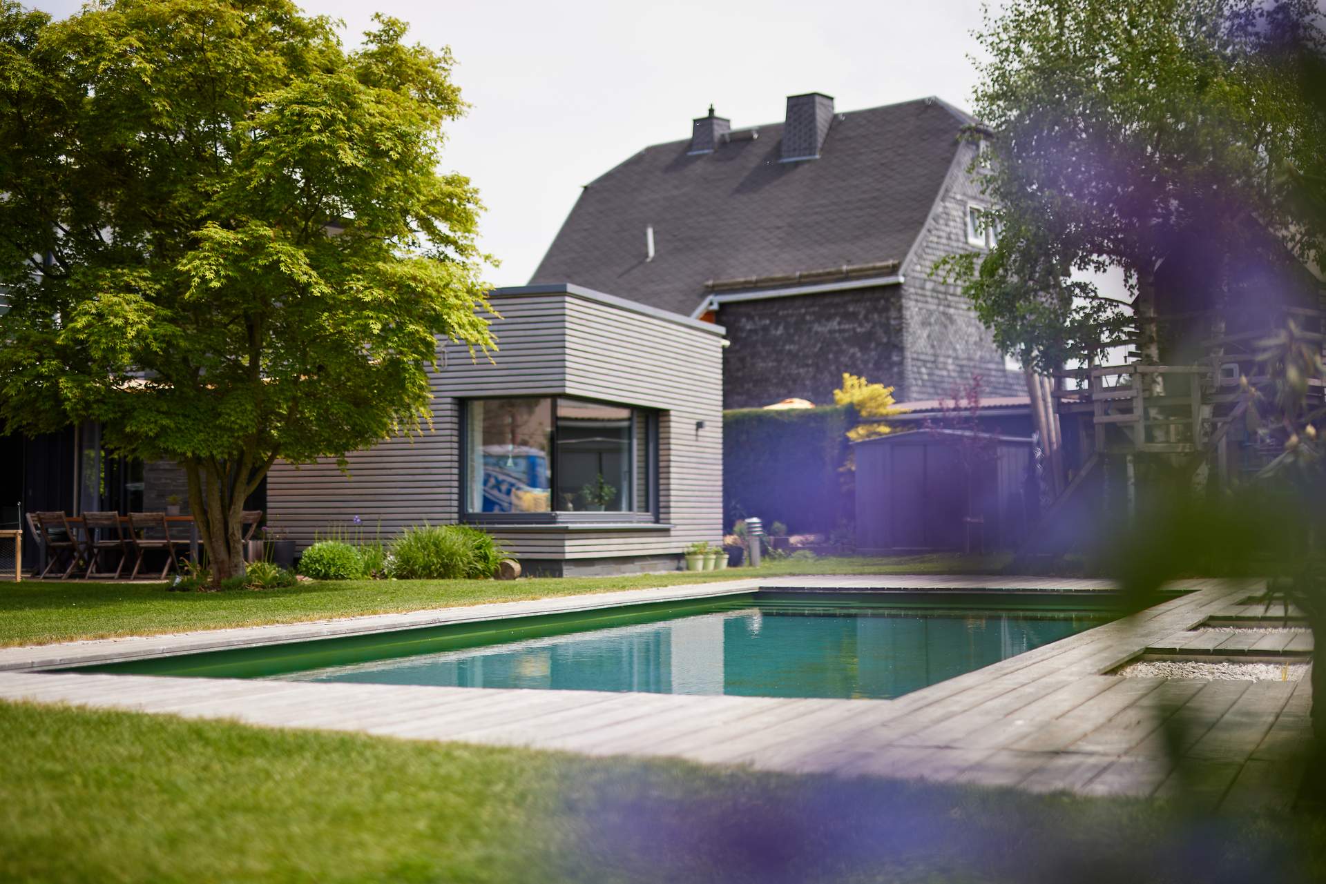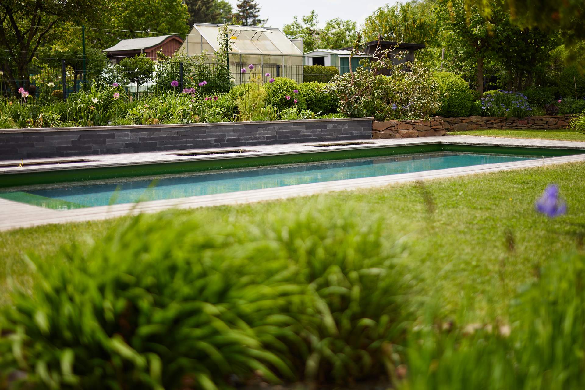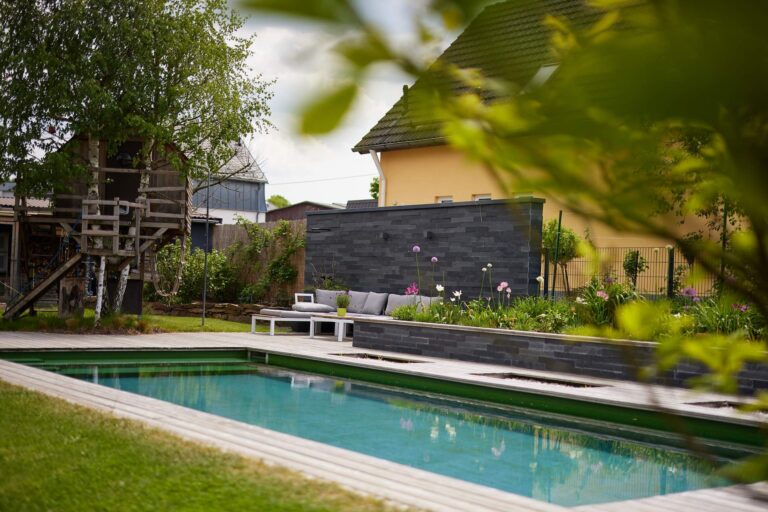 Im Zentrum des Gartens befindet sich der 4 x 11 m große Naturpool, der biologisches Baden auf hohem Niveau ermöglicht. Hier liegt der Fokus auf Schwimmen in klarem, natürlichem Wasser, frei von Chemie, aber mit allen Vorteilen moderner Wasseraufbereitung.