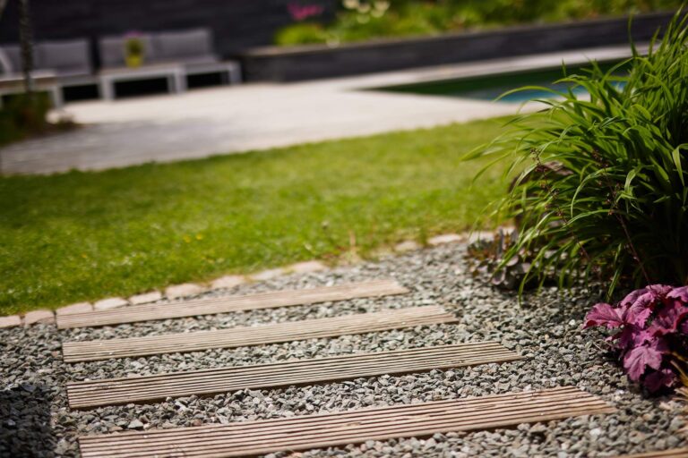 Ein besonderes Detail: Das Holz rund um den Pool stammt direkt von der Kundin selbst. Das Lärchenholz wurde in Eigenleistung weiterverarbeitet und verbaut, was dem Garten eine persönliche, authentische Note verleiht.