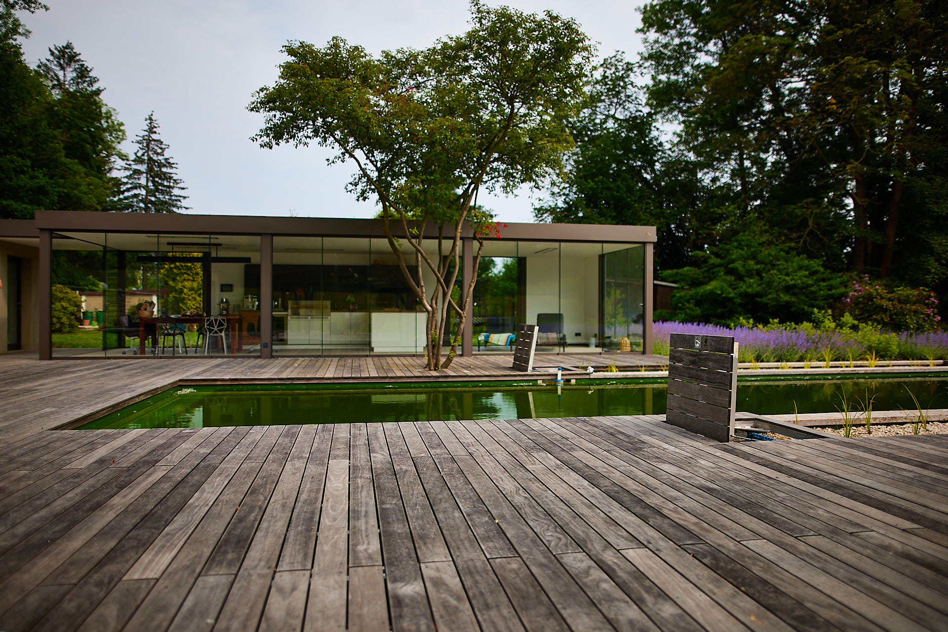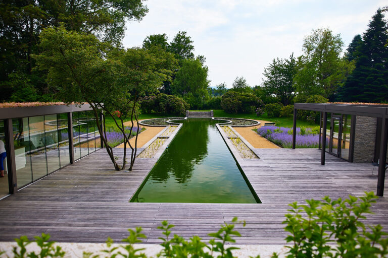 Das Herzstück des Gartens ist ein 38 m langer Naturpool in Schlüssellochform, welcher sich geradlinig, elegant und fließend in die Gartengestaltung einbettet. Dieser ist sowohl architektonisch als auch technisch ein Highlight.