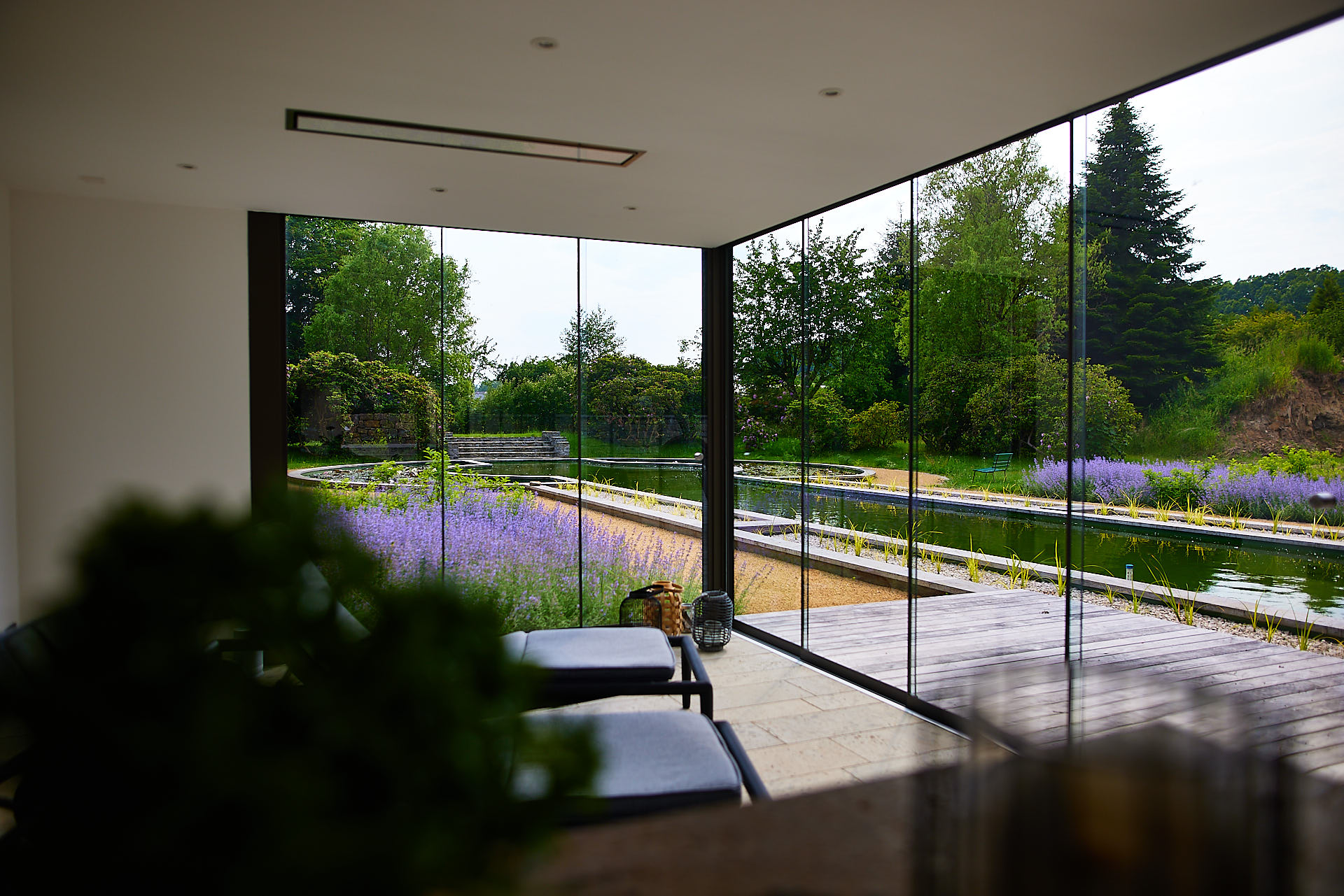 So bleibt der Blick auf den Pool jederzeit frei, egal, ob man sich beim Kochen, Entspannen oder Saunieren befindet.