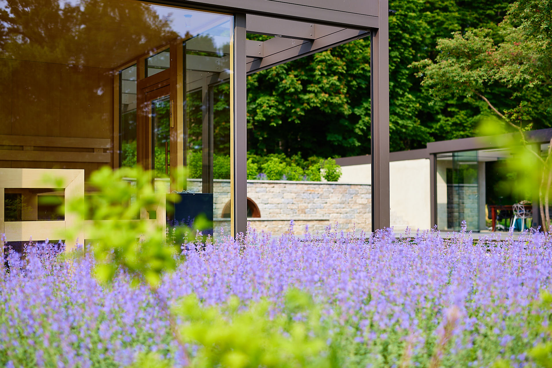 Dank des wiederkehrenden Gestaltungselements wirkt der Gartenbereich stimmig und einladend, die Zeit dort zu verbringen.