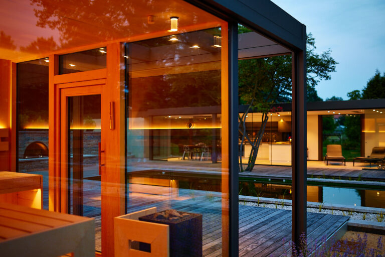 Sowohl Sauna als auch Küche sind bewusst offen und transparent gestaltet, ähnlich wie moderne Pergolen mit Glaswänden.