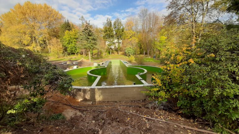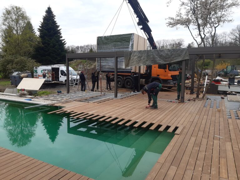In der Planung des Grundstücks stellten nicht nur die Historie, sondern auch der Boden gleich zu Beginn eine Herausforderung dar. Das Grundstück war stark vom früheren Kohlebau geprägt, wodurch der Boden hohes Grundwasser aufwies und wenig tragfähig war. Eine präzise Höhenplanung und die exakte Positionierung des Pools waren daher sehr entscheidend.