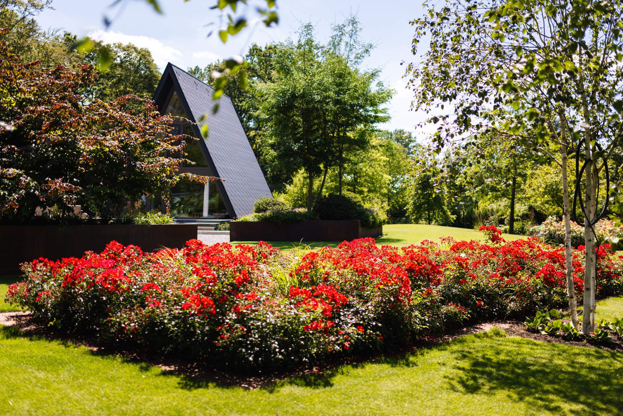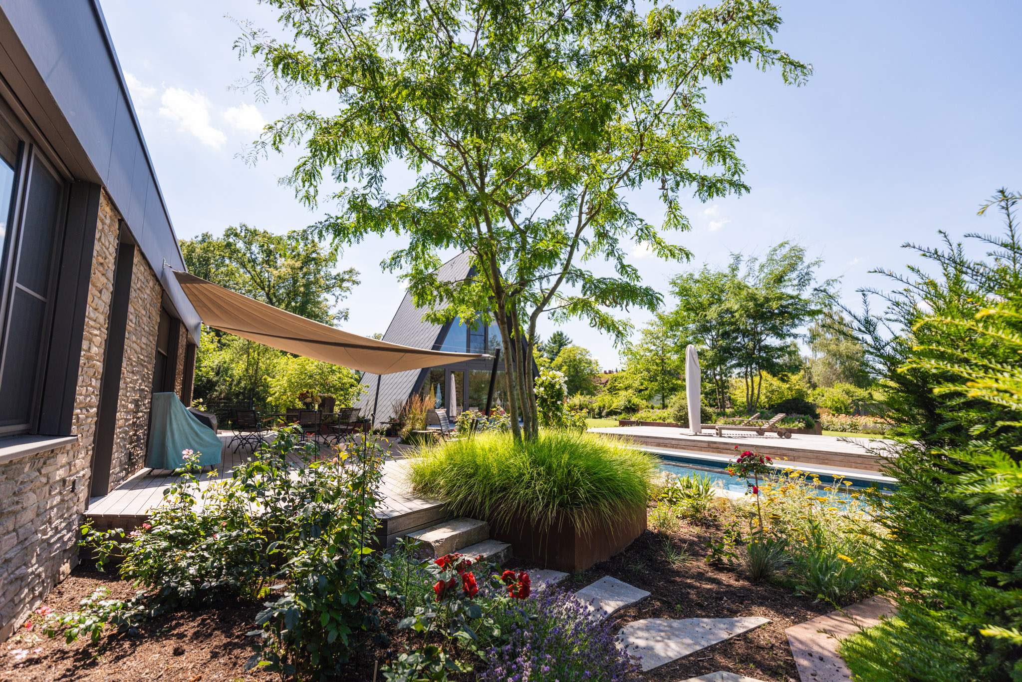 Grüne Pflanzungen, bewusst gewählte bunte Farbakzente durch Blumen und intelligente Wegführungen zwischen Räumen und Terrassen machen diesen Garten zu mehr als einer Grünfläche. Zu einem Rückzugsort für die Familie und einem bunten Kunstwerk.