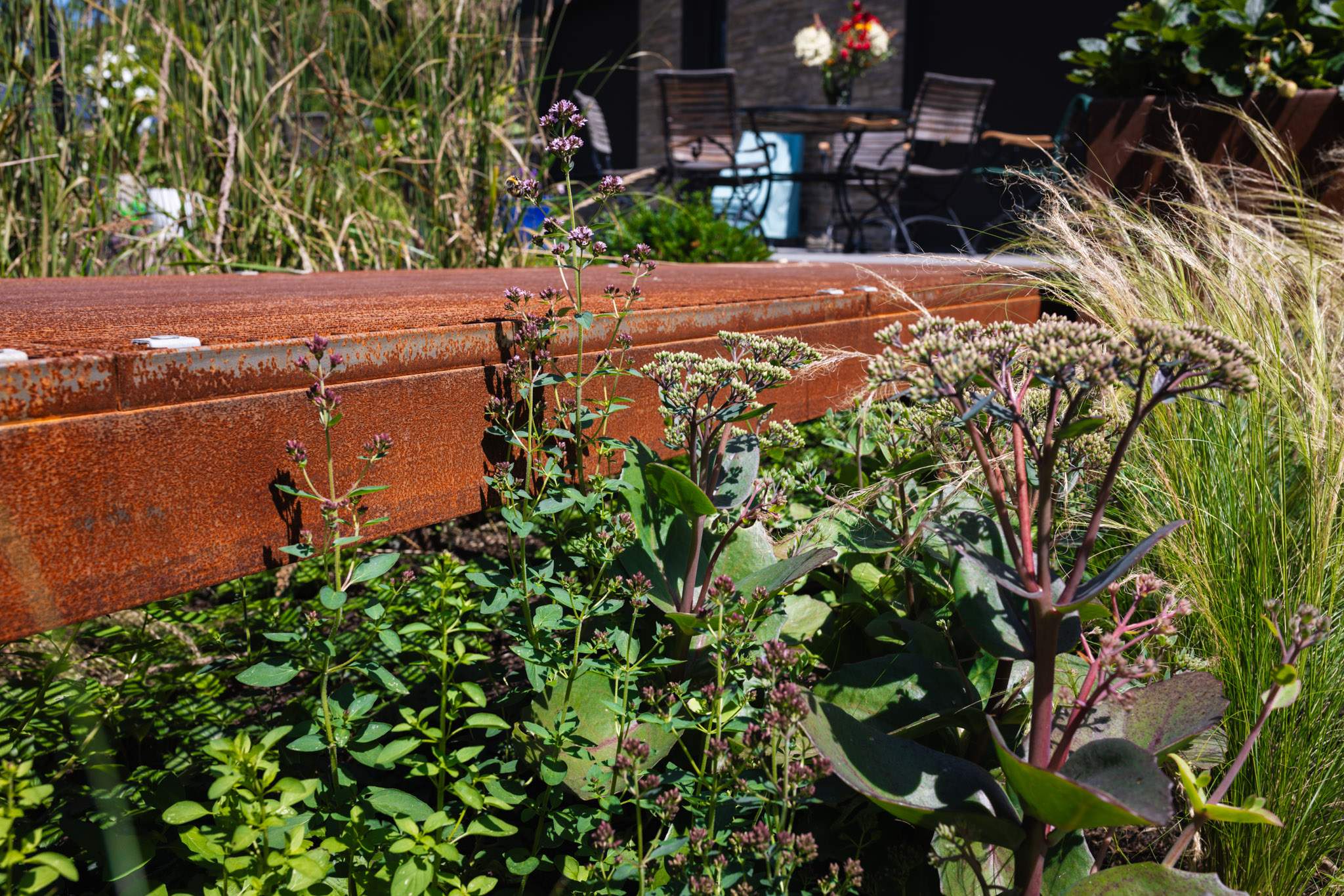 Cortenstahl als Gestaltungselement findet sich jedoch nicht nur in der Wegführung wieder. Auch in Megahochbeten ist das Material verbaut und lässt somit ein harmonisches Gesamtbild des Gartens entstehen.